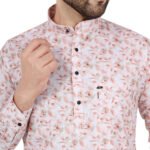 Add a fresh and elegant touch to your wardrobe with this men’s peach floral printed short kurta. Featuring a soft color palette with subtle leaf/floral patterns, this kurta gives a classy and premium look. The mandarin collar and full sleeves enhance its traditional appeal while keeping it modern and stylish. Ideal for casual outings, festive wear, and day events.